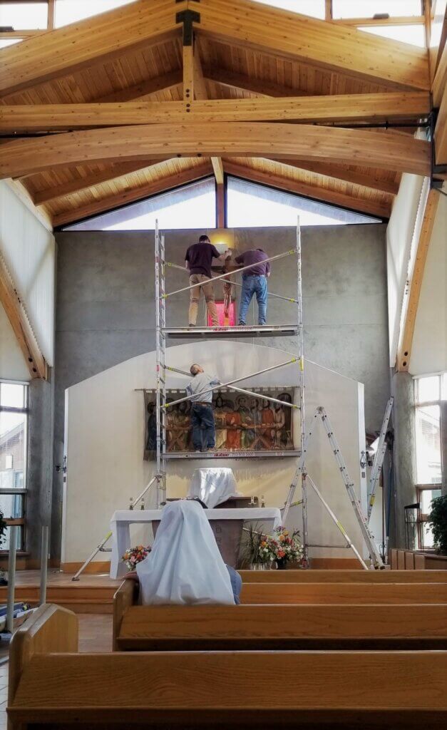In the process of hanging the tapestry and crucifixThe change in chapel décor was complete in time for Sister Maria-Placida’s vow renewal on July 11, the Solemnity of St. Benedict. Join us in praying for her as she now prepares for her solemn profession!