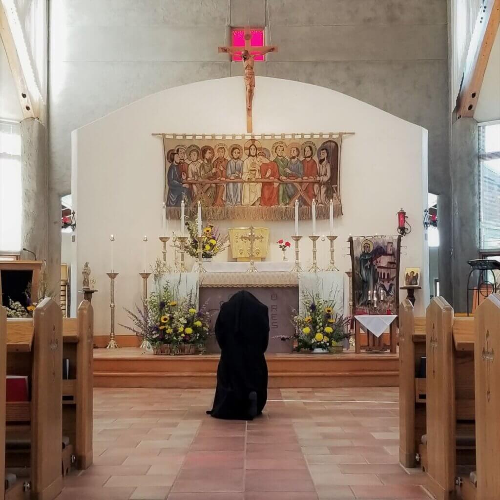 About the photos: In honor of the National Eucharistic Revival (running from Corpus Christi 2022 to Pentecost 2025), we recently changed the décor of our chapel, hanging behind the tabernacle the tapestry of the Last Supper. This tapestry, hand woven by a nun at our motherhouse in Germany, was originally in our chapel at Boulder, but when we moved to Virginia Dale it would not fit in the space along with our large clay crucifix. But by replacing that large crucifix with the smaller one we had been using in our refectory, we were able to have the Last Supper tapestry return to the chapel sanctuary.