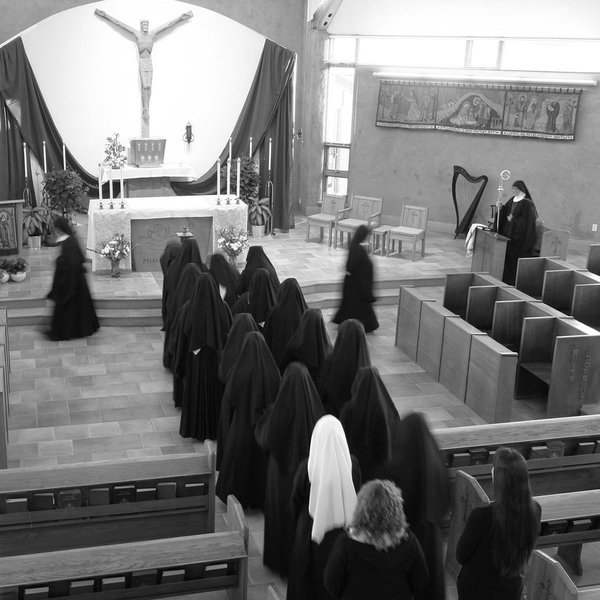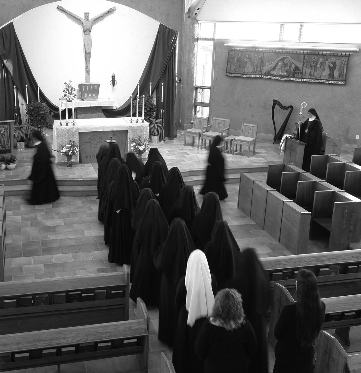 Our little Paschal Candle Department did a beautiful job with this year’s artwork. Sister Ancilla masterminded the unique pelican design, and Sister Fidelis the parting of the Red Sea design. Since about the 12th century the pelican has been a symbol of the Passion of Christ, since the mother is known to pierce her own chest to provide blood for her young if there is no other food available. The parting of the waters is reminiscent of the Catecheses by Saint John Chrysostom, bishop: