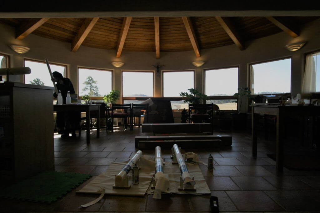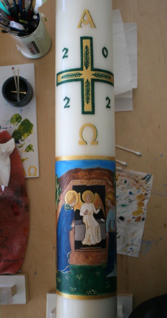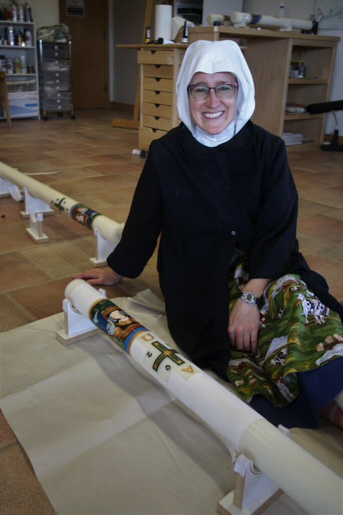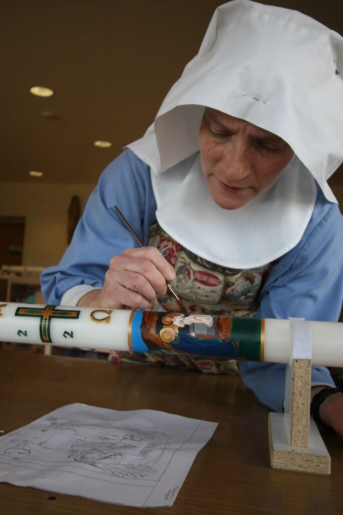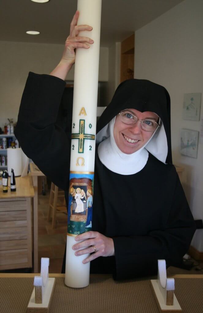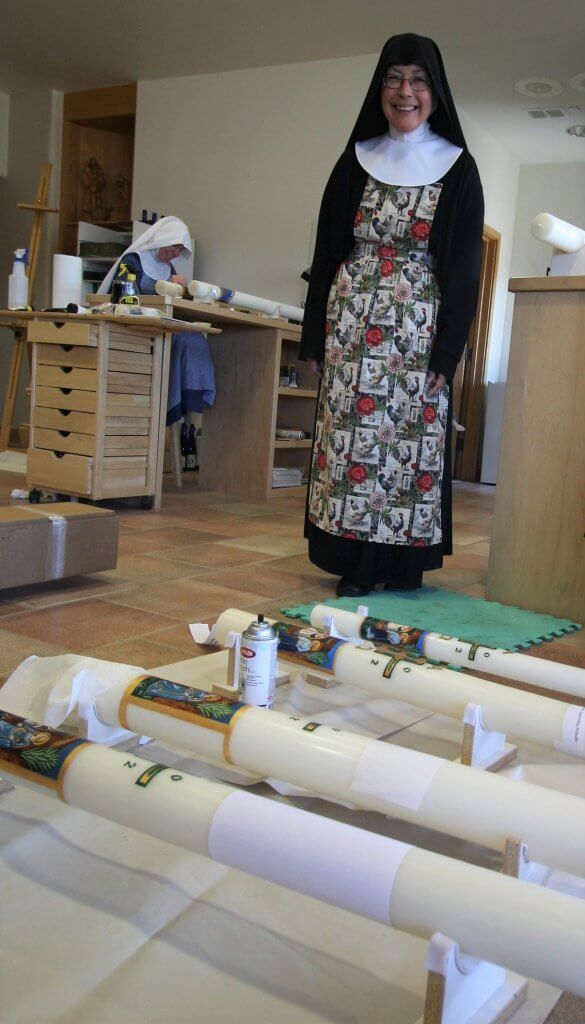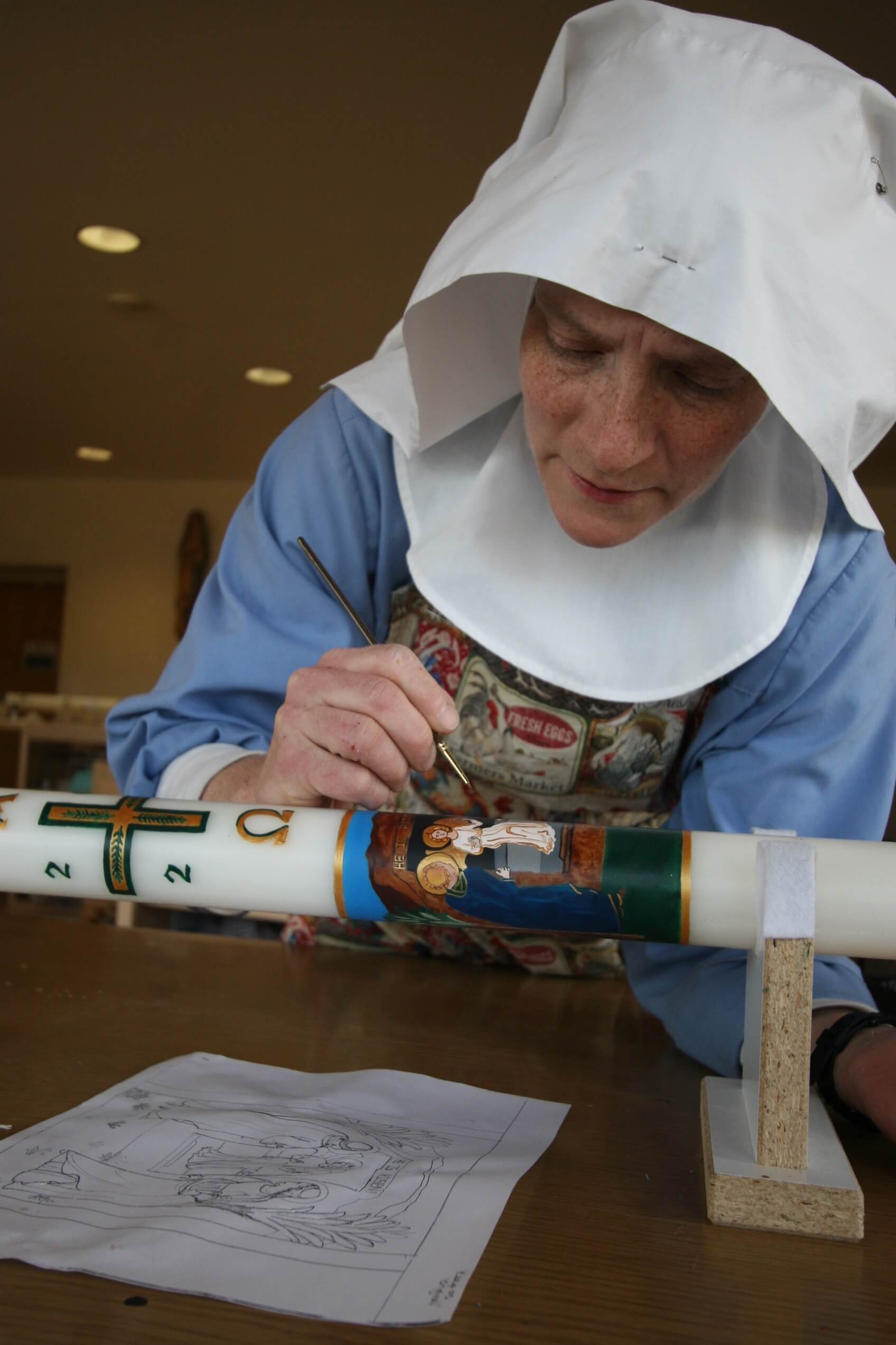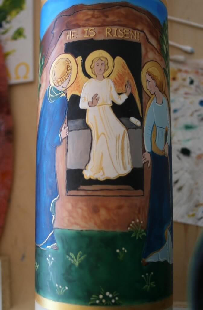 Thanks to the hard work of the Sisters in our paschal candle department, parishes across the state are now burning our hand-painted candles in their churches. Sister Fidelis’ beautiful scene of the tomb on Easter morning was replicated by each artist on candles large and small, depending on what each parish ordered. Paschal candles are used during the Easter Vigil Mass to carry the flame from the Easter fire into the church, and from which every other candle in the church is lit, as a symbol of Christ the true Light enlightening the world and dispelling the darkness of evil.